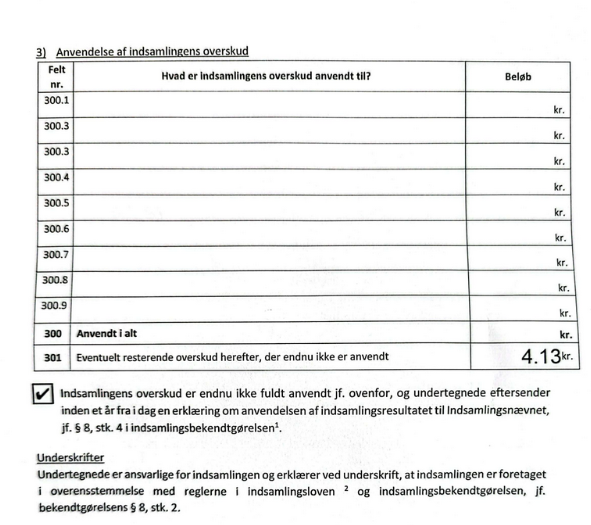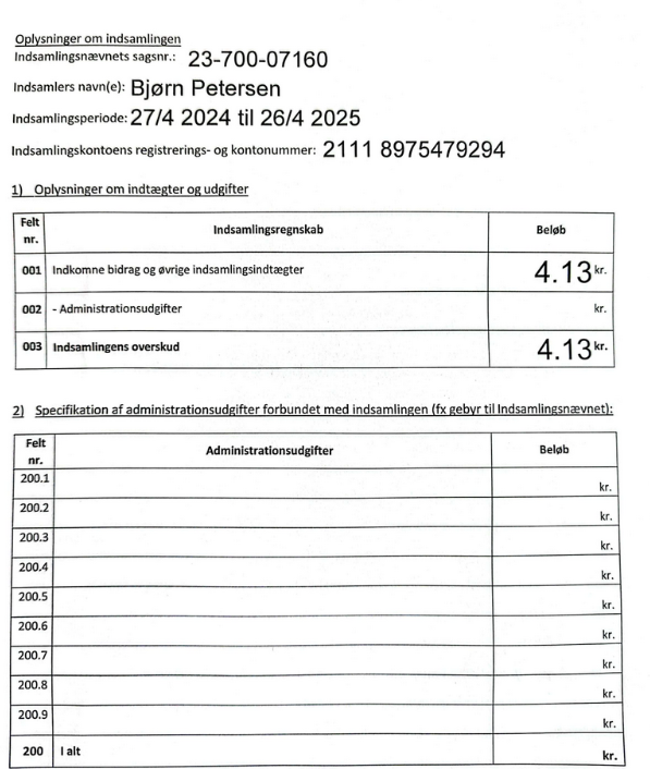 Ifølge reglerne for indsamling, skal regnskabet anføres på hjemmesiden, uanset aktiv status eller ej. Der er påløbet renter på det resterende beløb og jeg vedhæfter opgørelsen for perioden 27/4 2023 - 26/4 2024